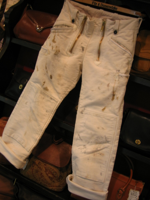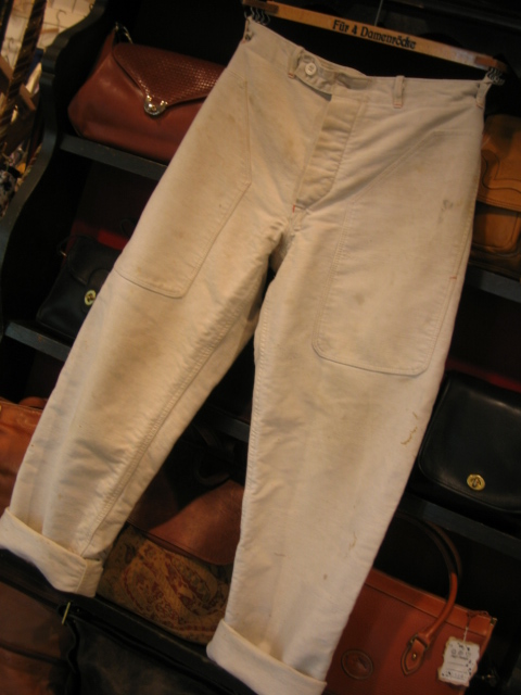 ドイツの古いワークパンツでモールスキンという保温性・耐久性に優れた素材でできています。ちなみに語源はモグラの皮で、ミリタリーにも採用されています。この色でモールスキンのものは中々珍しく、汚れ具合も好みです。