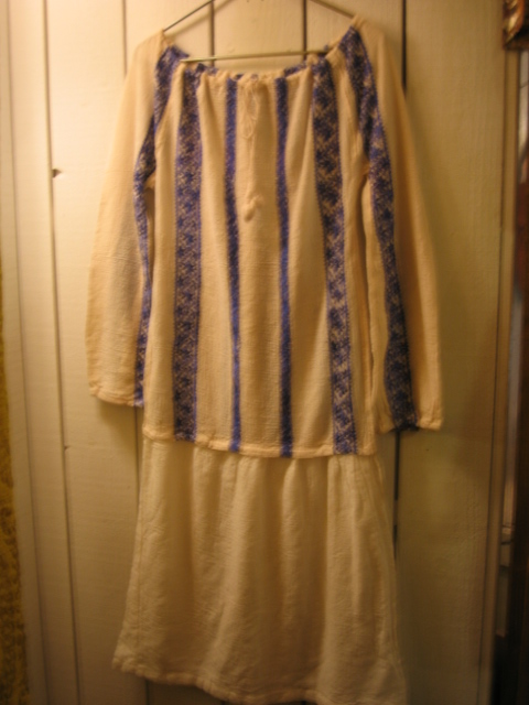 デッドストックで2色入荷したコットンクレープ地のルーマニア刺繍が施された古いスモックドレス。首元のドローコードでギャザー分量を調節できマス。大変希少なもので倉庫の方も初めて見た、と言っていました。