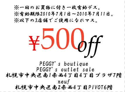 neufは明日30日から、ペギ&恒例のPEGGY's OUTLET saleは7月1日からとうとうsale!!です。今回も気合入ってマスヨ~