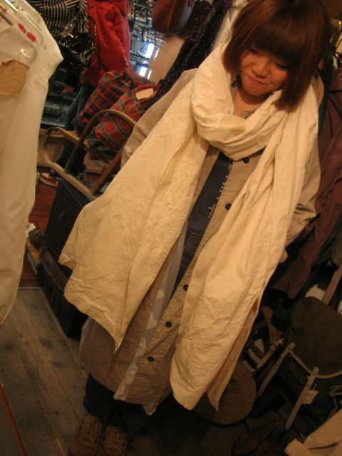 ちなみに画像で着用してるのは昨日入荷のリサイズのワークコート&本日入荷のデットストックのリネンを使用した超大判ロングストールです。こちらは2回程洗いをかけたもので、まだ少々硬いですが、使用と洗濯を繰り返す度にやわらかくなじんできます。